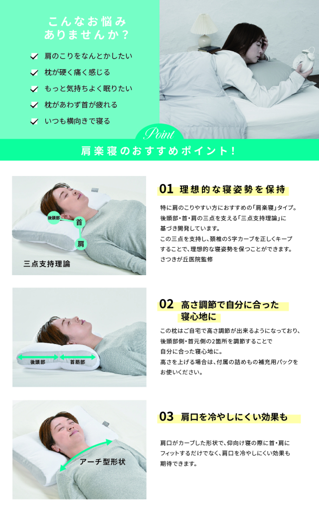 硬めに詰め込んだソフトなパイプが、しっかりとした肌触りで頭部を支えます。