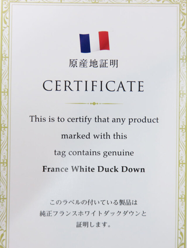中身;フランス産ホワイトダックダウン90%、スモールフェザー10%、0.8kg入